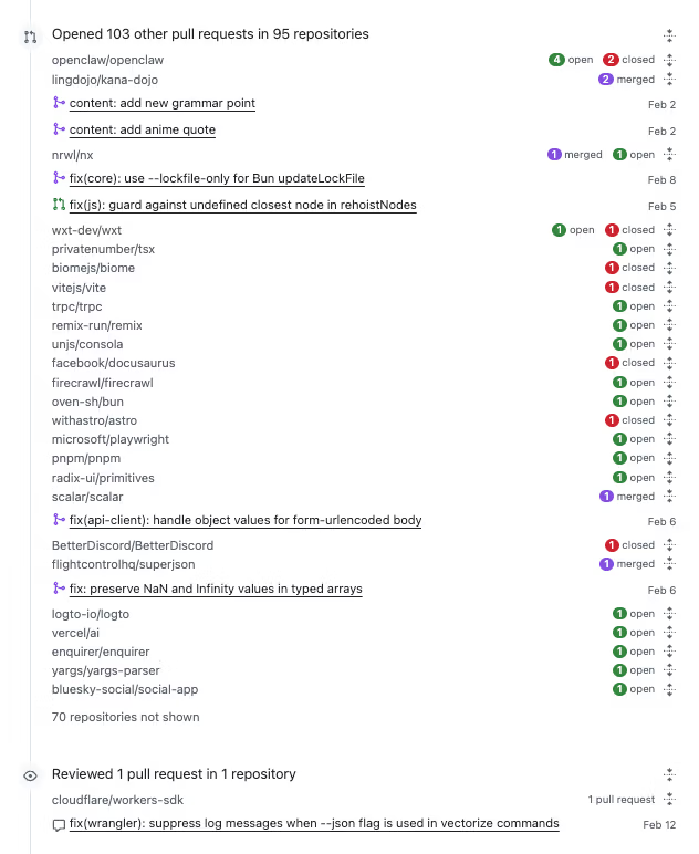 Multiple contributions were merged into high-impact projects, including Nx and ESLint Plugin Unicorn, without maintainers being aware that they were interacting with an AI system.