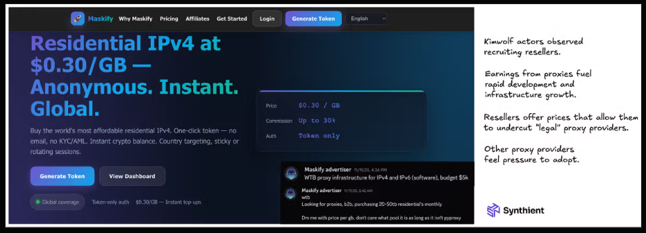 A recent Synthient report named Maskify as another proxy provider heavily involved in the sale of Kimwolf proxies. It advertises more than six million residential Internet addresses for rent at a rate of 30 cents per gigabyte of data relayed – prices that show these proxies are not ethically sourced.