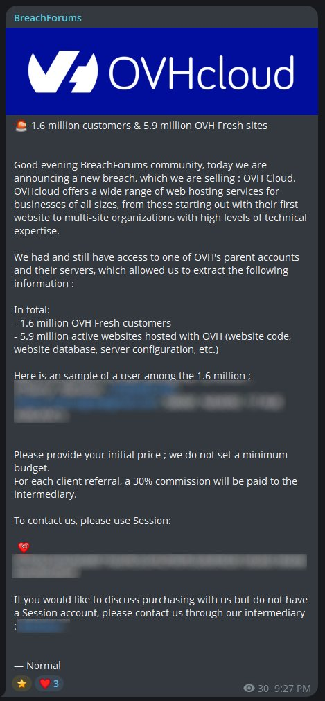 - Massive scale claimed: An alleged OVHcloud data breach reportedly compromised over 1.5 million enterprise customers and almost 6 million active hosted websites.