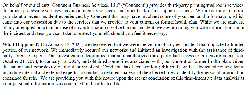 Conduent breach notification letter | Source: Maine Attorney General