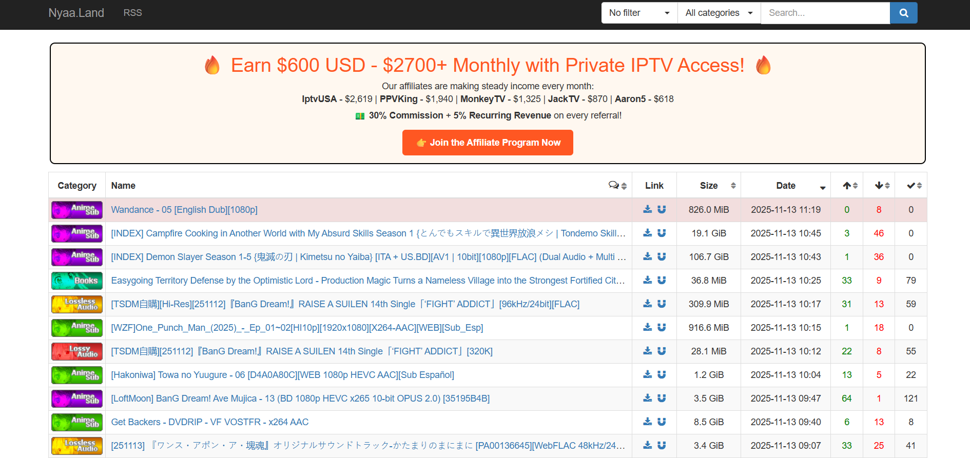 When you first land on Nyaa.Land, you’re greeted by a clean, stripped‑down listing of torrent entries specializing in e-book, anime and related media. The site offers deep category filters (Anime, AMV, Live Action, Literature, Audio, Pictures, Software / Games) so you can hone in on what you’re looking for. Nyaa