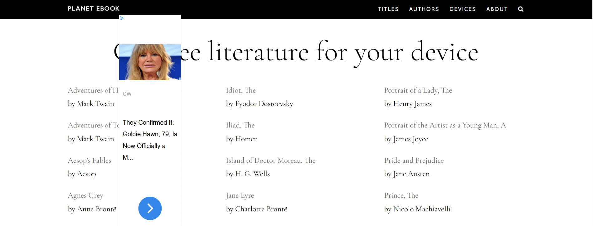 Once you visit Planet eBook for the first time, you’ll find a clean catalogue of classic texts, for example the listing for The Iliad by Homer offers direct download links in ePub, PDF or MOBI formats.