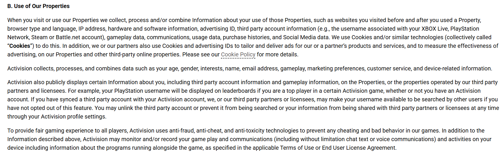 Activision also collects a wide range of user data when you interact with its properties. As outlined in their privacy policy, this includes gameplay communications, voice data, device identifiers, and even integration with third-party services like Xbox Live and Steam. Anti-cheat and anti-fraud technologies are actively monitoring for suspicious behavior, and VPN usage that masks your location or enables unauthorized access could trigger enforcement mechanisms. Even if your VPN is technically secure, it won’t protect you from being flagged if it’s used to exploit the game’s systems.