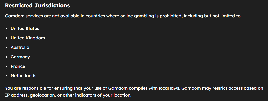 Gamdom’s Terms don’t explicitly promise a “VPN detection system,” but they clearly state they may block users “based on IP address, geolocation, or other indicators of your location.”