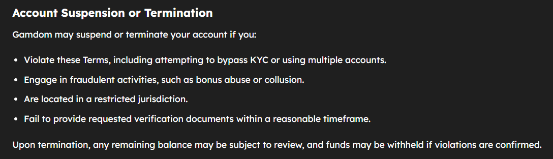 In other words, using a VPN to fake your location is a serious breach of their Terms, and Gamdom reserves full discretion to enforce those rules.