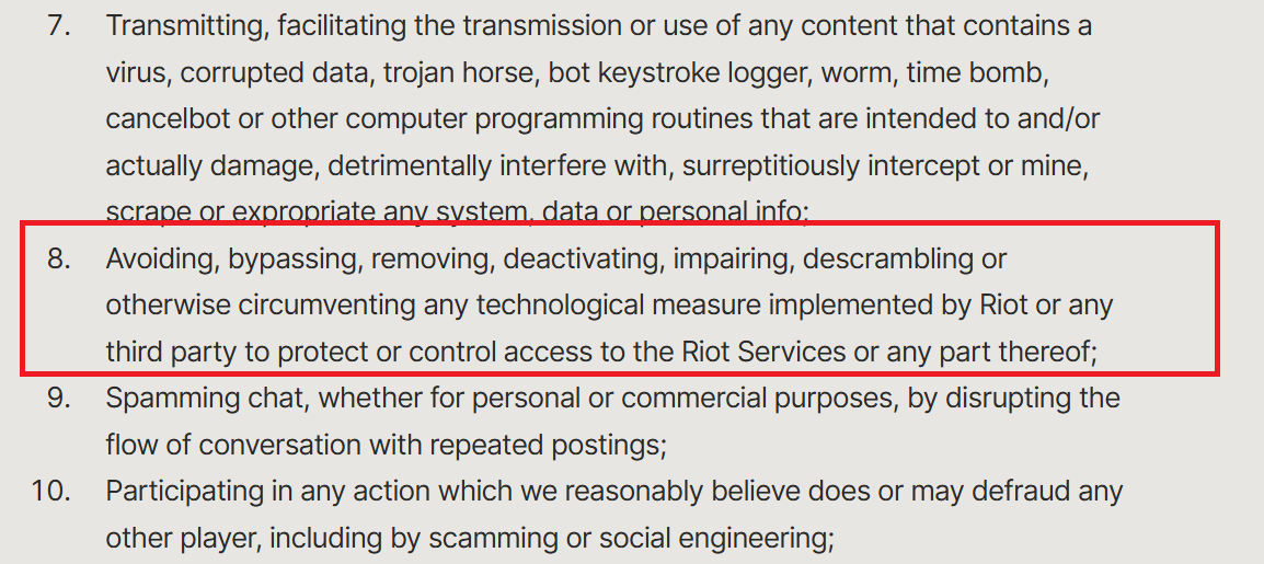 Screenshot of Riot’s Terms of Service highlighting a clause that prohibits bypassing technological measures to access Riot Services.