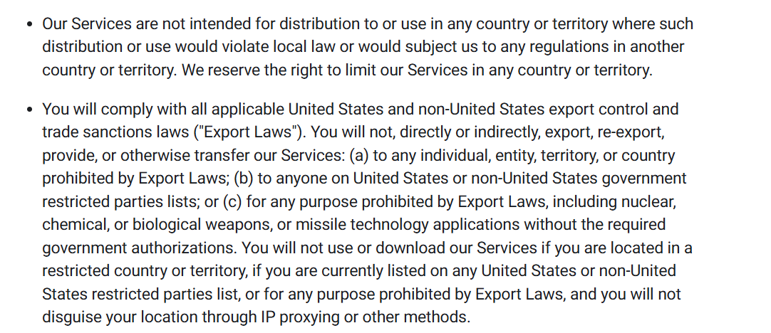 WhatsApp’s terms prohibit using its services in countries or territories where such access violates local laws or international sanctions. Meta’s export compliance policy bans service use by individuals on restricted parties lists or in regions under U.S. or non-U.S. trade sanctions. Location may be determined through IP proxying or other methods, meaning VPN misuse in restricted zones can trigger enforcement.