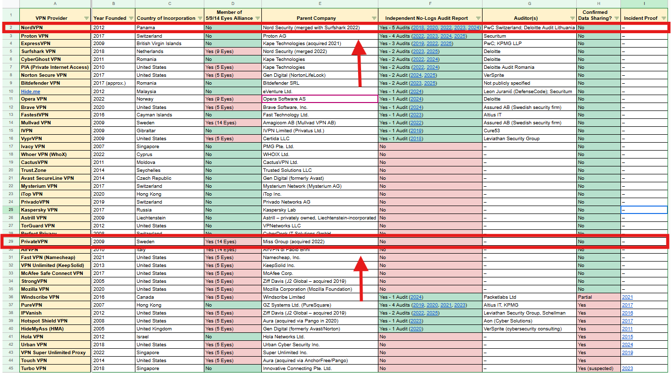 That’s why, in our VPN sheet, we not only mark alliance membership but also include details like independent no-logs audits and parent company ownership. These elements help you judge whether a VPN based in an Eyes country still offers strong privacy protections, or whether you should look elsewhere.