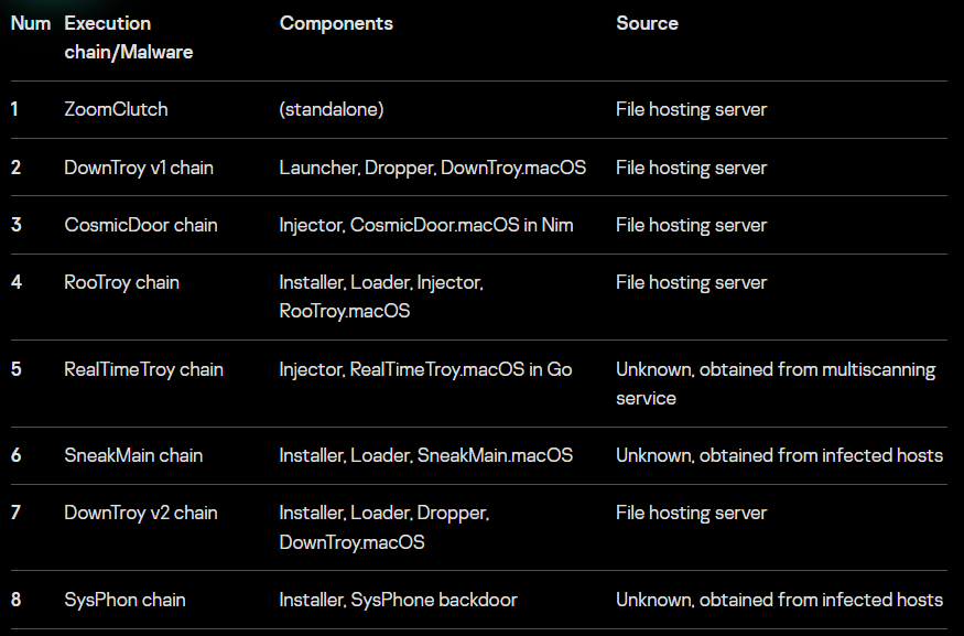 Security researchers at SecureList by Kaspersky discovered seven multi-component infection chains, a keylogger, and a stealer suite that exfiltrates cryptocurrency wallets, Keychain data, package managers, infrastructure setups, as well as cloud platforms and DevOps details, along with notes, API keys for OpenAI, collaboration application data, and browsers, messengers, and Telegram credentials.