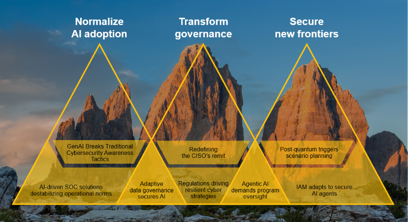 Gartner’s top cybersecurity trends for 2026 fall into three distinct themes: normalize AI adoption, secure new frontiers, and transform governance | Source: Gartner