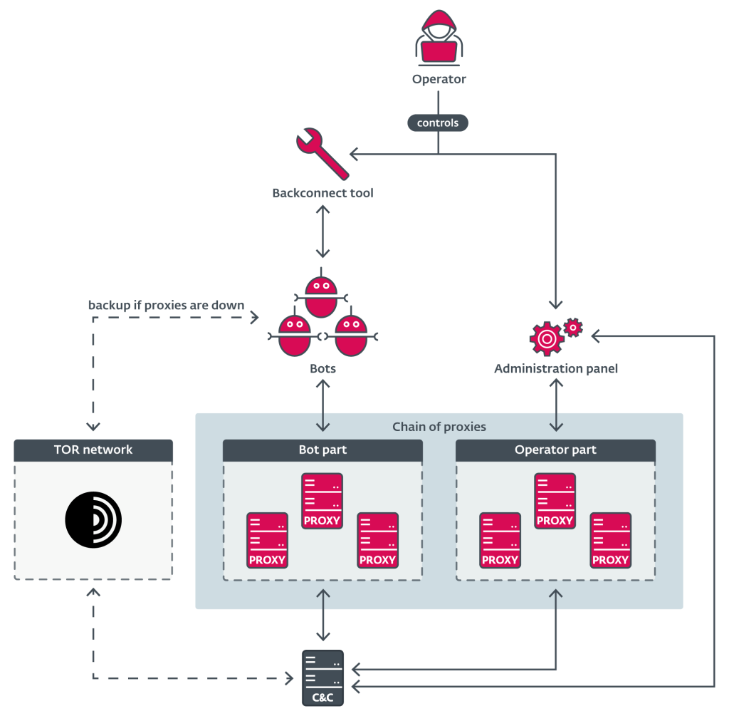 Several C2 endpoints have been identified, alongside backconnect servers designed to facilitate reverse shell connections and access to compromised systems.