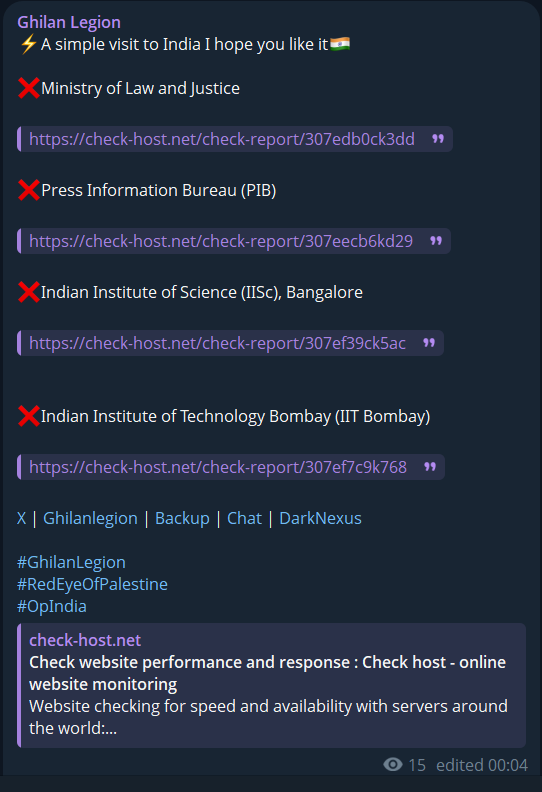 Two distinct threat actor groups have publicly claimed responsibility for the incidents targeting India. The group known as Ghilan Legion declared it attacked the: