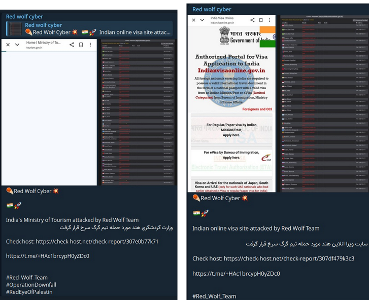 In a separate claim, the group Red Wolf Cyber stated it was behind DDoS attacks on Indian websites of Government of India's e-Visa services portal and the Ministry of Tourism.