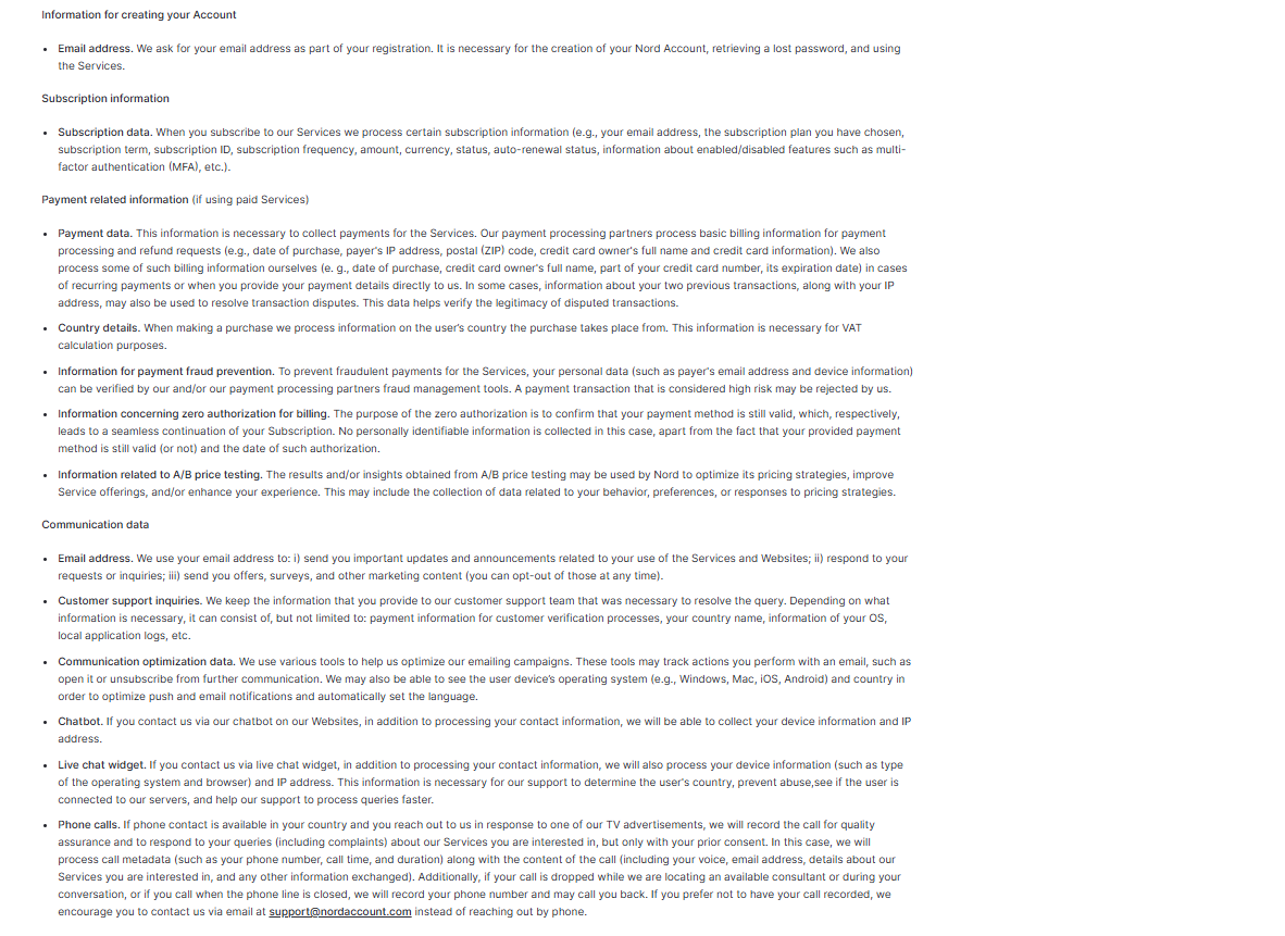 In addition, NordVPN tracks server performance. Also, timestamps of the latest session and your username are stored up to 15 minutes. To prevent any unfair chargebacks, it also tracks whether a person has used the service in the last 30 days. Moreover, it also keeps anonymous interaction data to prevent prohibited activities like scraping.