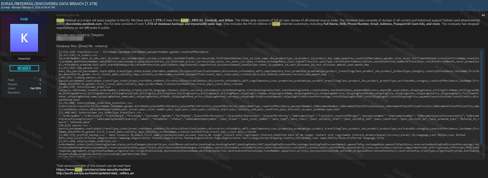 February claim of Eurail/Interrail/DiscoverEU breach | Source: Dark Web Informer