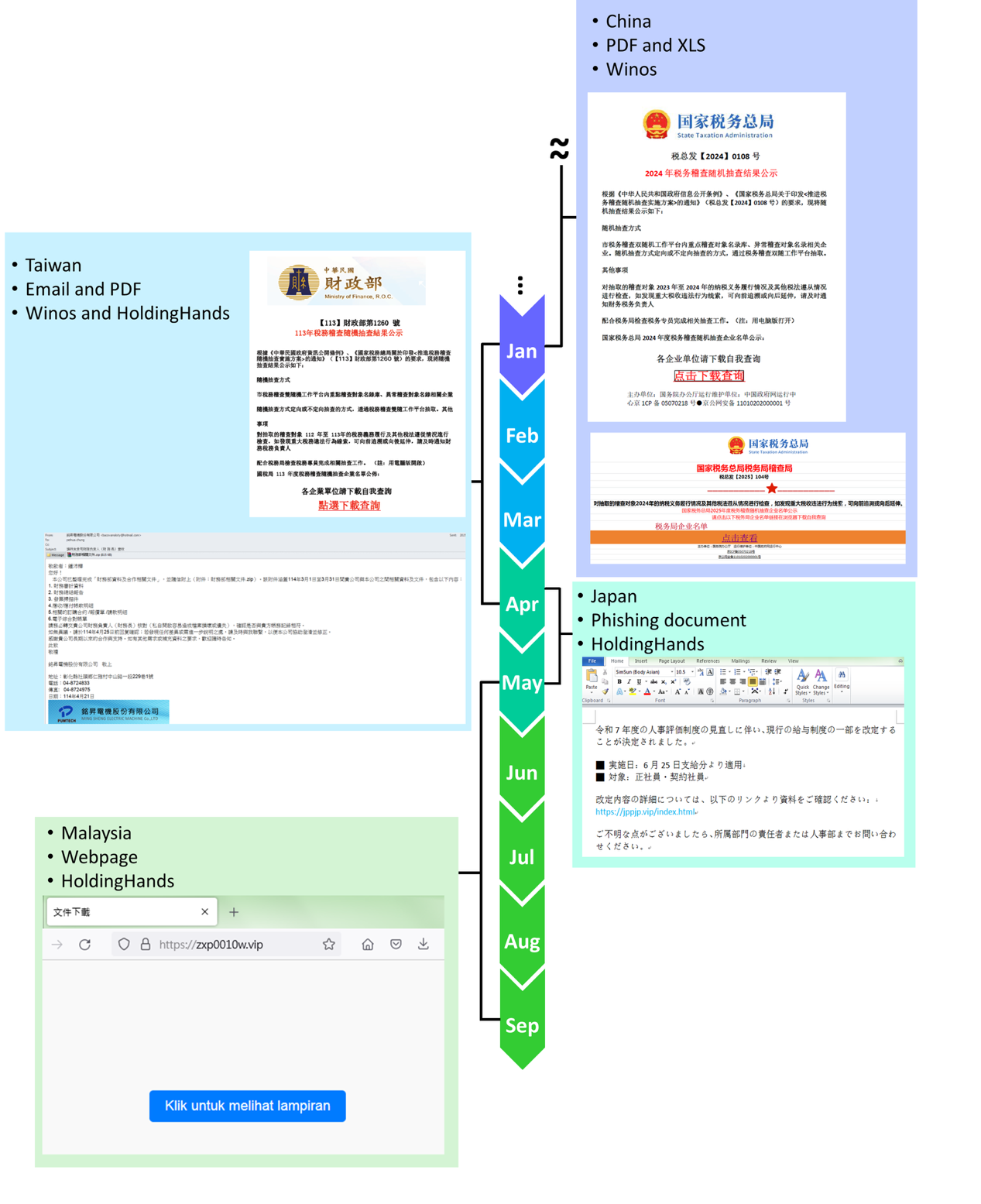 Later attacks utilized custom domains with regional naming patterns, such as including "tw" for Taiwan, to host the malware. A PDF that posed as a draft of a tax regulation for Taiwan redirected to a page in Japanese containing a HoldingHands payload ZIP.