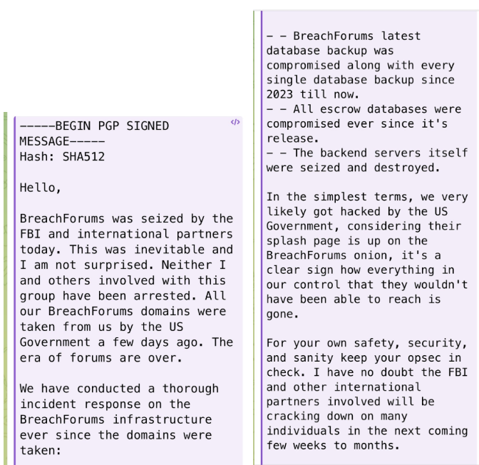 The clearnet domain of BreachForums has been seized. The admin team, operating under the name ShinyHunters, confirmed the seizure through a signed message, acknowledging the takedown and the compromise of their backend servers.