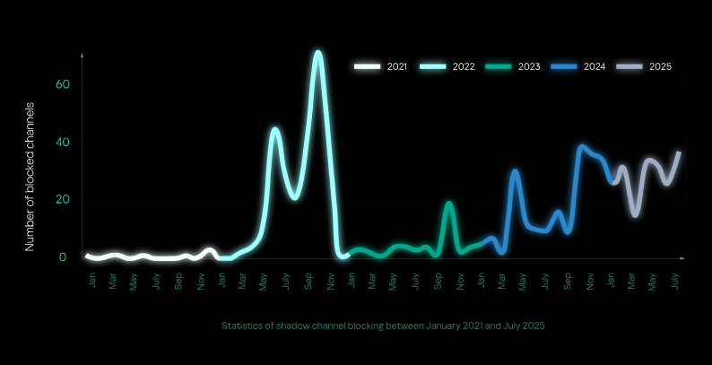 While channel blocks have become more frequent since October 2024, causing some cybercriminals to migrate, the median lifespan of these illicit channels has risen from five months to nine months.