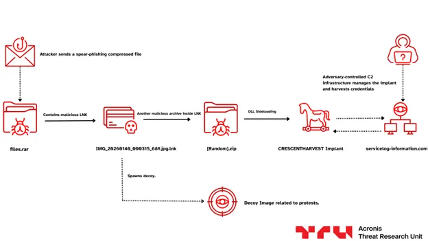 Threat actors are distributing weaponized files masquerading as legitimate protest videos and intelligence reports. These vectors deliver an advanced malware variant, CRESCENTHARVEST, engineered for comprehensive data exfiltration.