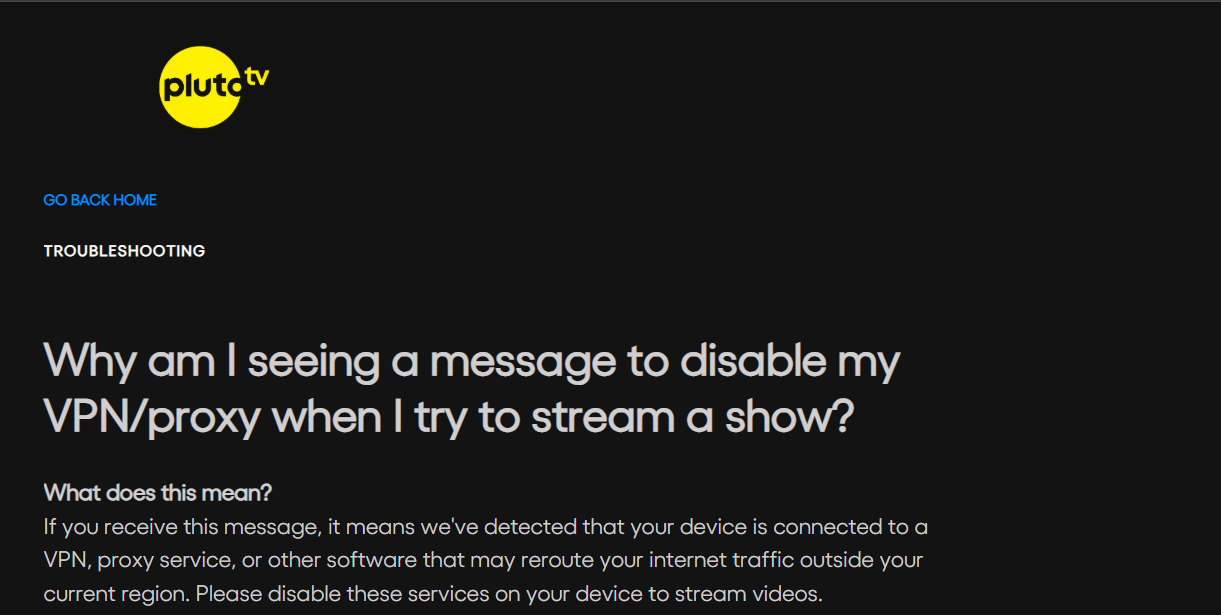 Pluto TV can detect VPNs, especially low-quality or free ones, and may block access if it suspects you're rerouting your traffic. As shown in the troubleshooting message from Pluto TV, users often see prompts asking them to disable their VPN or proxy before streaming. This happens when Pluto TV identifies that your connection is coming through a masked IP or anonymized route, which violates its geo-restriction protocols.