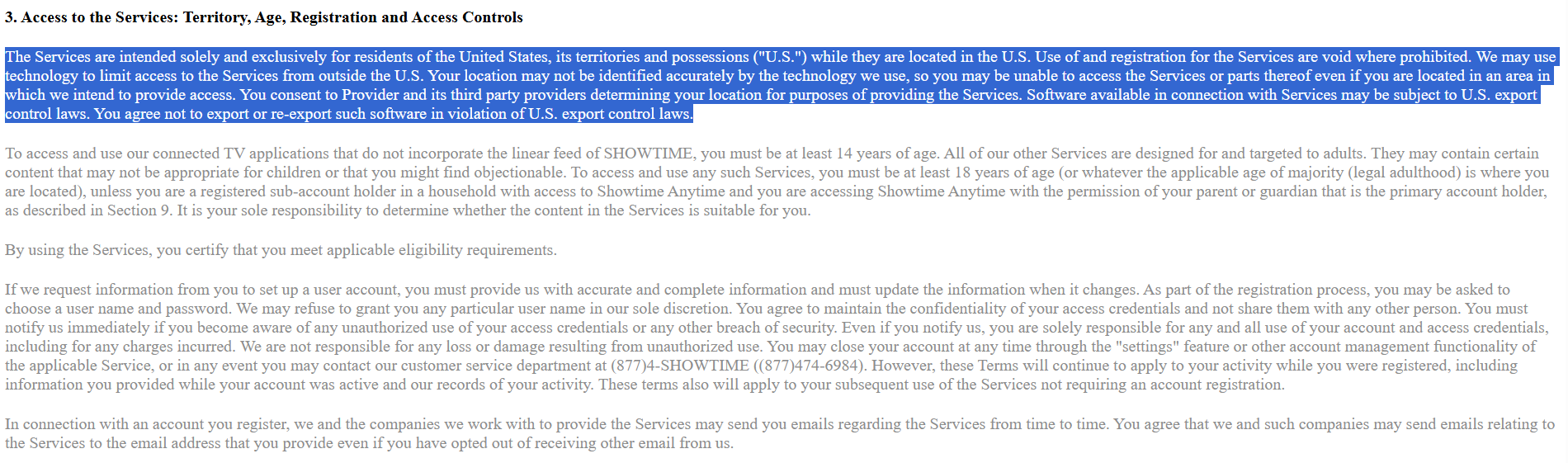 Using a VPN to stream Showtime, or any geo-restricted content, sits in a legal gray zone that depends heavily on your location and the terms of service of the platform. While VPNs themselves are legal in most countries, using them to bypass regional restrictions may violate the streaming provider’s user agreement. For example, Showtime’s terms may prohibit accessing content outside designated territories, especially if you're not a U.S. resident. Their services are intended solely for U.S. residents, and accessing them from abroad could trigger export control violations or service blocks.