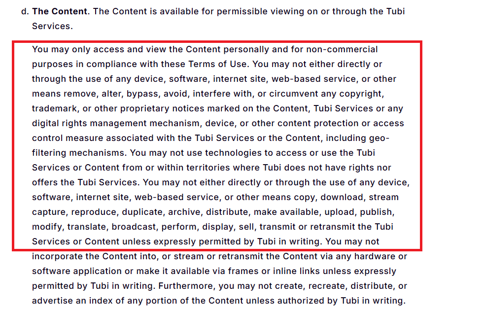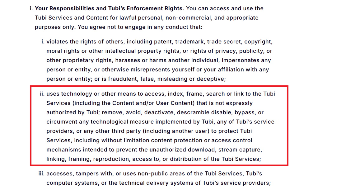 Tubi TV doesn’t shout “no VPNs allowed” from the rooftops, but it’s not exactly rolling out the red carpet either. Its Terms of Service steer clear of naming VPNs directly, yet they do lay down some serious ground rules. Under Your Responsibilities and Tubi’s Enforcement Rights, users are warned against using tech to bypass access controls or protection systems. Translation? If you’re using a VPN to sneak past geo-restrictions, you’re skating on thin ice, technically speaking.