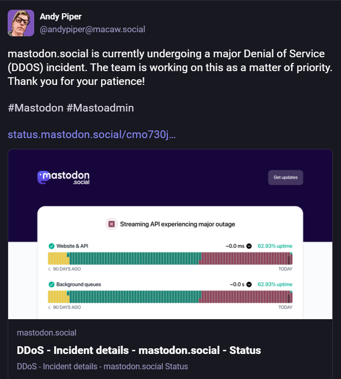 Mastodon DDoS announcement | Source: Andy Piper