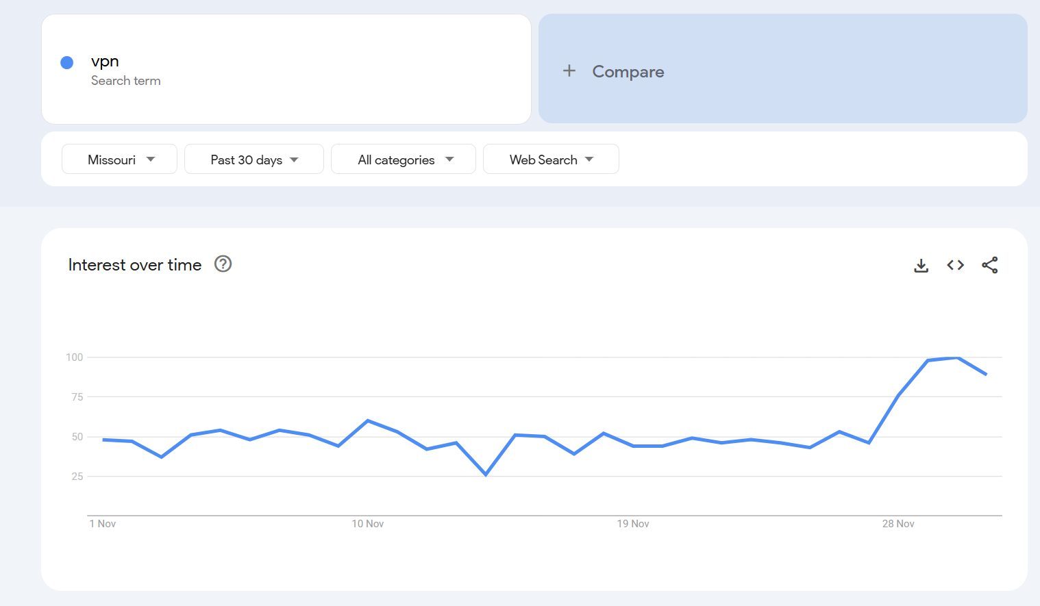 Google Trends data shows Missouri searches for “VPN” remained steady through most of the past two weeks but spiked on November 27, just days before the law went live.