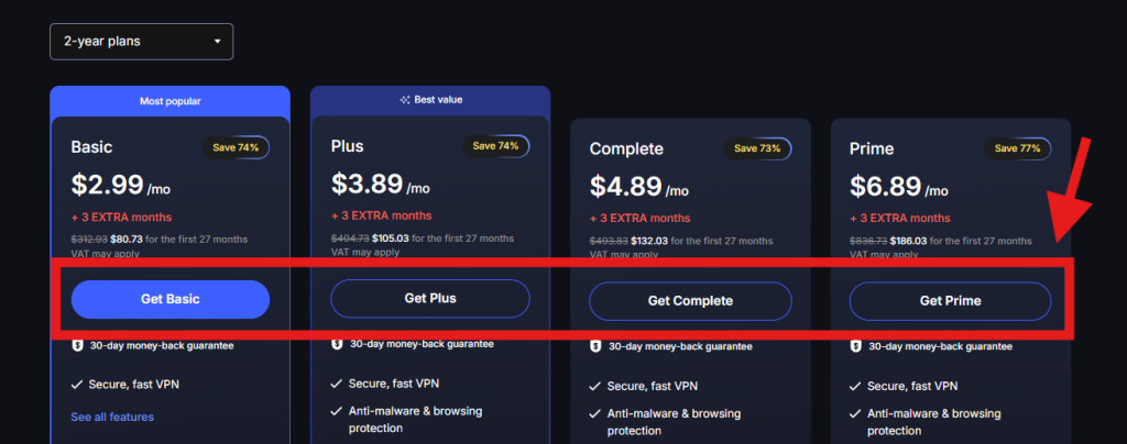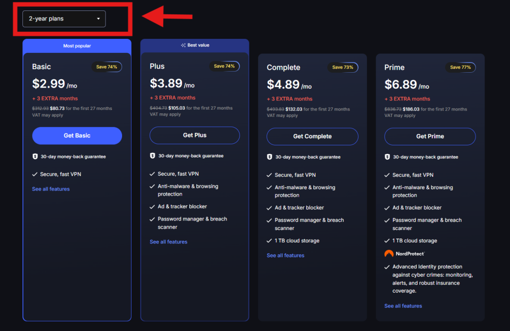 All long-term NordVPN plans are part of its Black Friday deal. If you want to pay the least, go for the Basic 2-year plan, priced at $2.99/month. However, check the other plans if you require other features as well. Here's a handy overview.