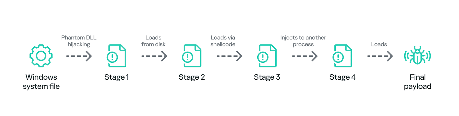 The campaign is distinguished by its use of custom APT implants and well-known offensive security tools. The attackers deploy a multi-stage loading chain that begins with Phantom DLL Hijacking for persistence, loading an oversized (100+ MB) DLL into legitimate system processes like svchost.exe.Â