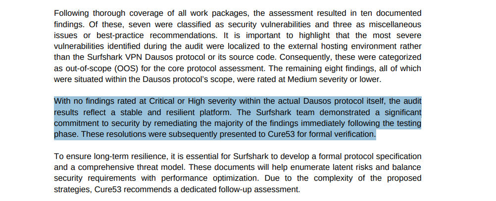 - Surfshark Dausos audit findings: Cure53 audit found no critical or high severity vulnerabilities within Dausos protocol scope