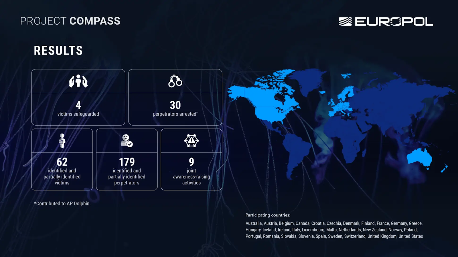 • International Collaboration: Project Compass unites law enforcement from 28 countries, including EU Member States and international partners like the US, UK, Canada, and Australia.