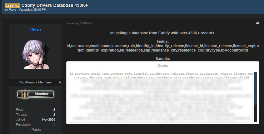 A threat actor using the alias Perro has claimed responsibility for an alleged Cabify data breach, offering a database for sale that allegedly contains the personal information of over 430,000 drivers of the ridesharing service in Spain.