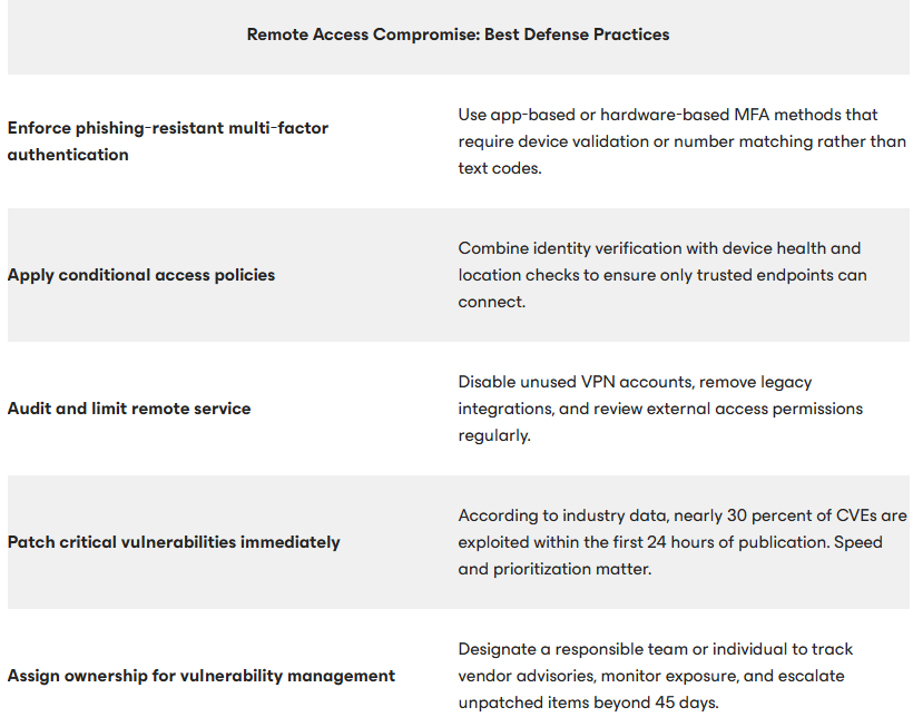To counter remote access compromise, organizations must enforce phishing-resistant MFA and implement strict conditional access policies that verify device health and location before granting network access.