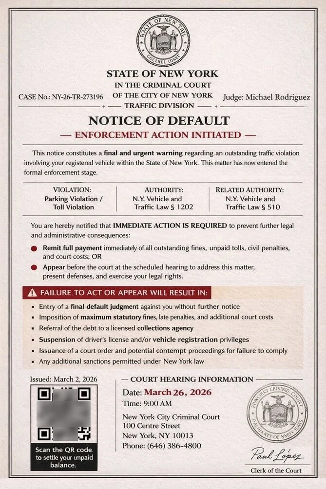 A traffic violation fraud campaign distributes fake "Notice of Default" documents via SMS to residents across US jurisdictions, including New York and California. The phishing campaign impersonates state judicial institutions, using urgency-based social engineering to compel immediate financial remittance or face judicial enforcement action.