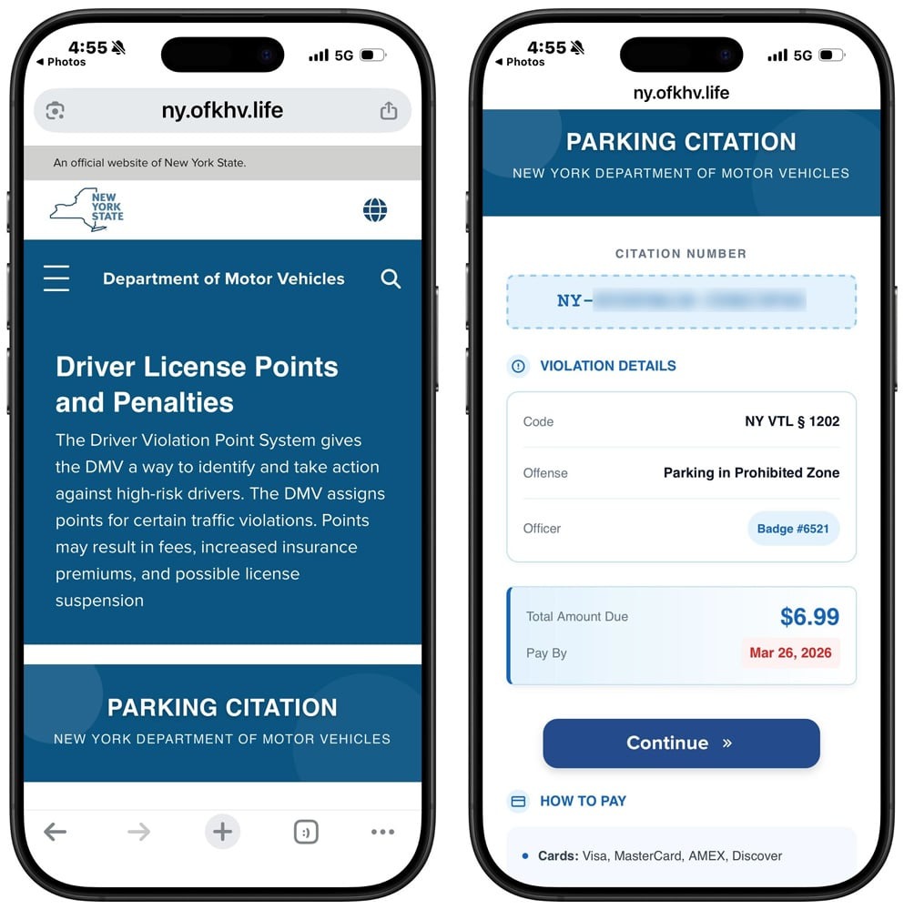 The fraudulent infrastructure demands a $6.99 settlement for the fake violation. When entering payment details, threat actors immediately exfiltrate comprehensive PII, including name, residential address, phone number, email address, and payment card data.