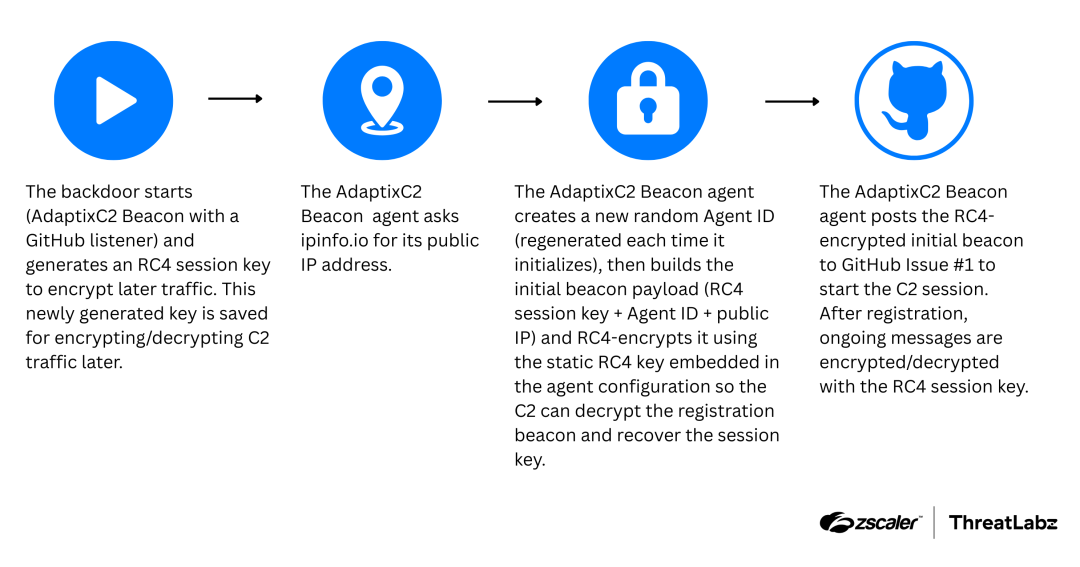 The primary payload in this campaign is the open-source AdaptixC2 Beacon agent, which retrieves its external IP address and establishes a session by posting encrypted data to GitHub Issues. The malware utilizes a 16-byte RC4 session key to encrypt all C2 traffic.