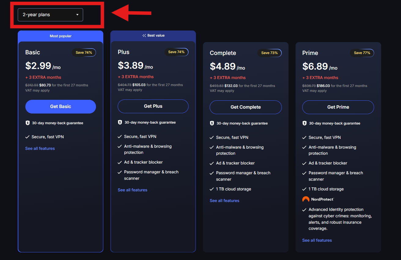 Bottom Line: NordVPN’s best Black Friday deal is the Basic 2-Year Plan at $2.99/month, perfect for secure browsing at a low price. If you want added malware protection and password tools, the Plus plan at $3.89/month is a strong upgrade. For maximum security, scam call protection, cloud storage, and full identity insurance, the Prime plan at $6.89/month delivers the most complete coverage. The monthly plan is excluded and not recommended. If you have decided to go with NordVPN, then we suggest you check its complete pricing (broken down tier-wise and year-wise).