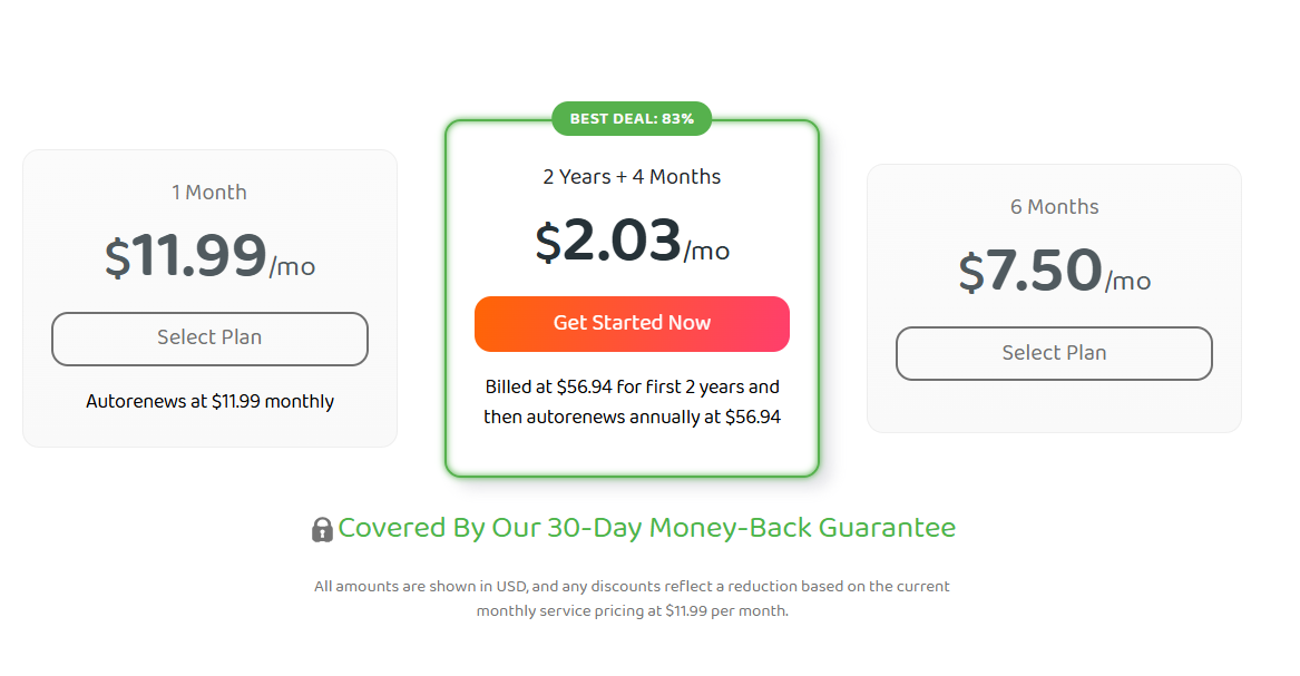 For example, the 2-year plan actually comes with an extra 4 months free, bringing the effective cost down to $2.03 per month. You’ll be billed $56.94 upfront for the first 2 years, and after that, the plan auto-renews annually at the same $56.94 rate.