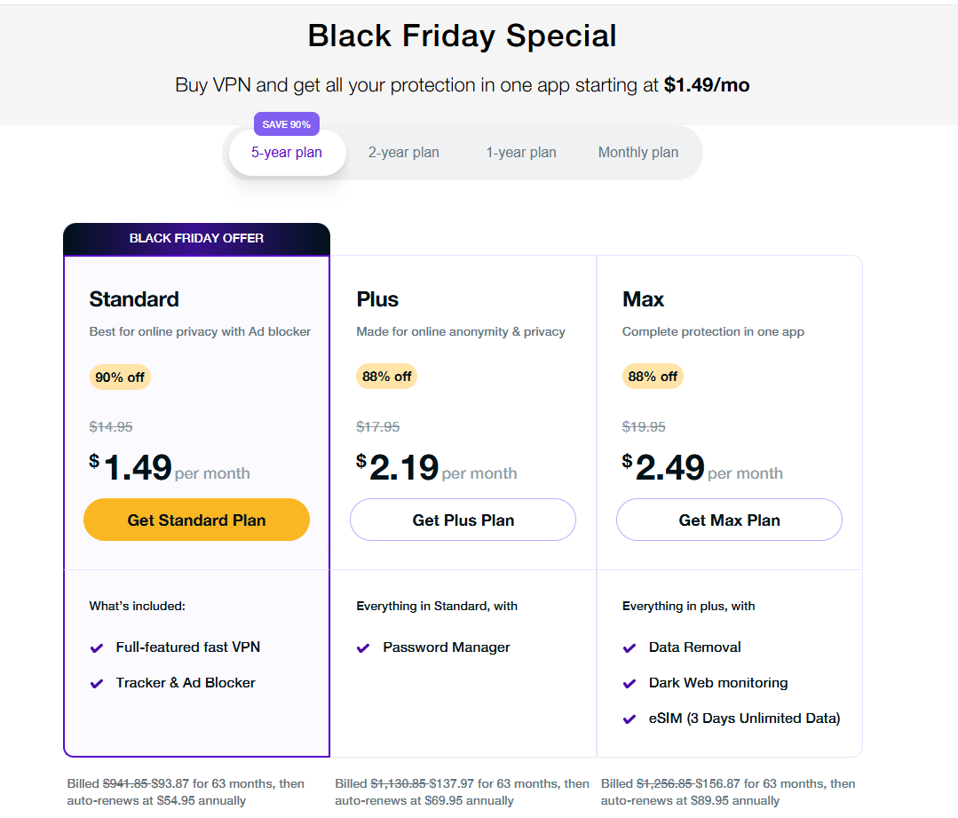 Bottom Line: The best Black Friday deal on PureVPN is the Standard 5-Year Plan at just $1.49/month for 63 months. If you want password management, the Plus tier starts at $2.19/month. And if you’re looking for full privacy protection, including data removal, dark web monitoring, and mobile data perks, the Max plan starts at $2.49/month for 5 years. Avoid the monthly plan as it’s expensive and not part of the deal.